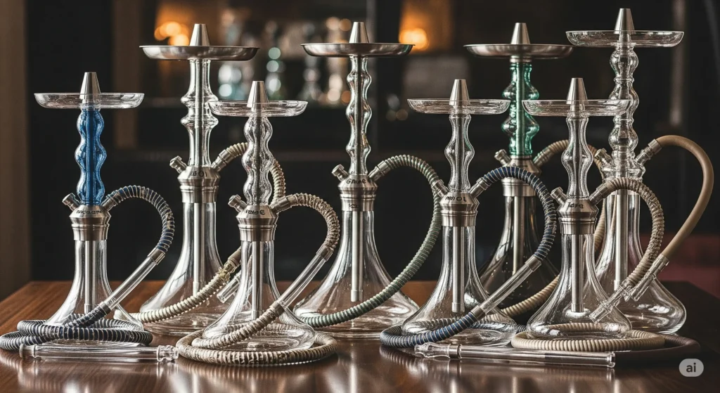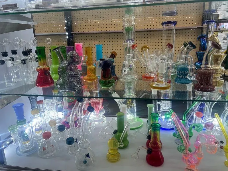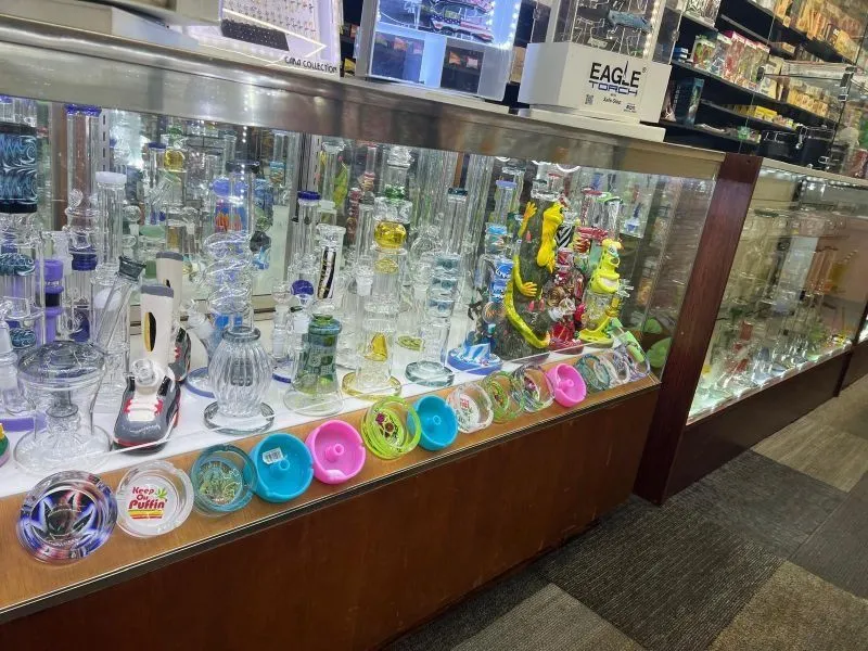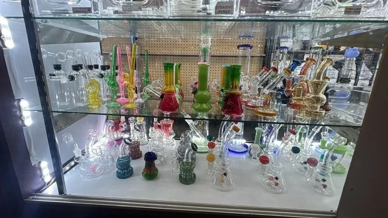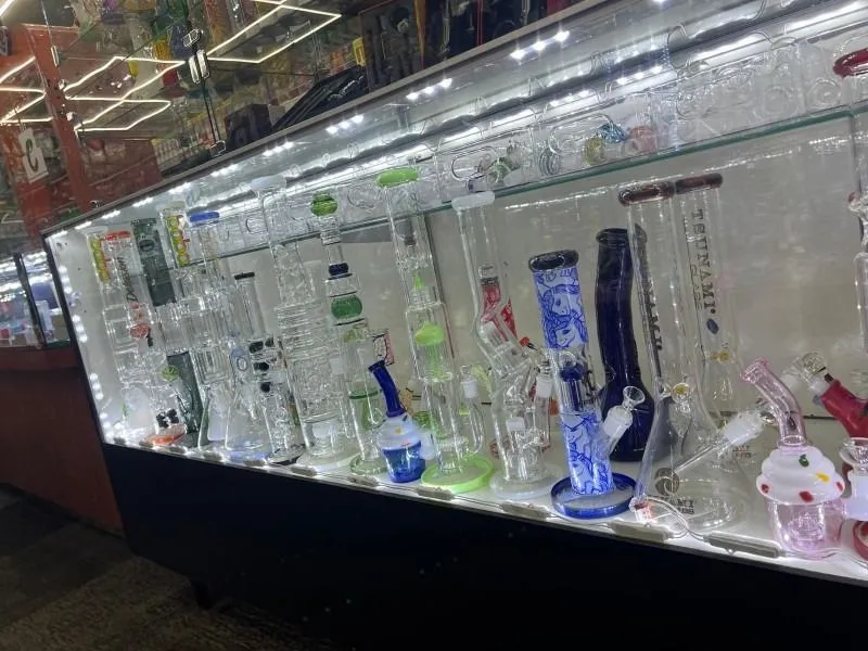 > Extensive inventory of glass pipes, water pipes, hookahs, vape products, and oils